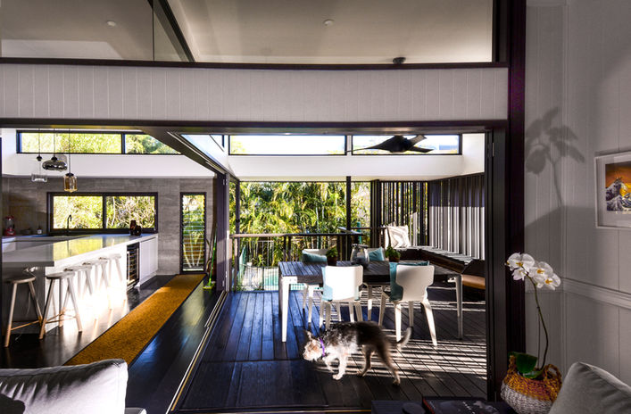 A Queenslander cottage was transformed by the additional of a north facing pavilion to the rear of house, overlooking the back garden. The pavilion was split into a new kitchen and external deck seamlessly linked and connected to the existing house with large glazed, sliding doors. Clerestorey windows float the roof and blur the distinction between inside and outside to create a light filled, airy space.